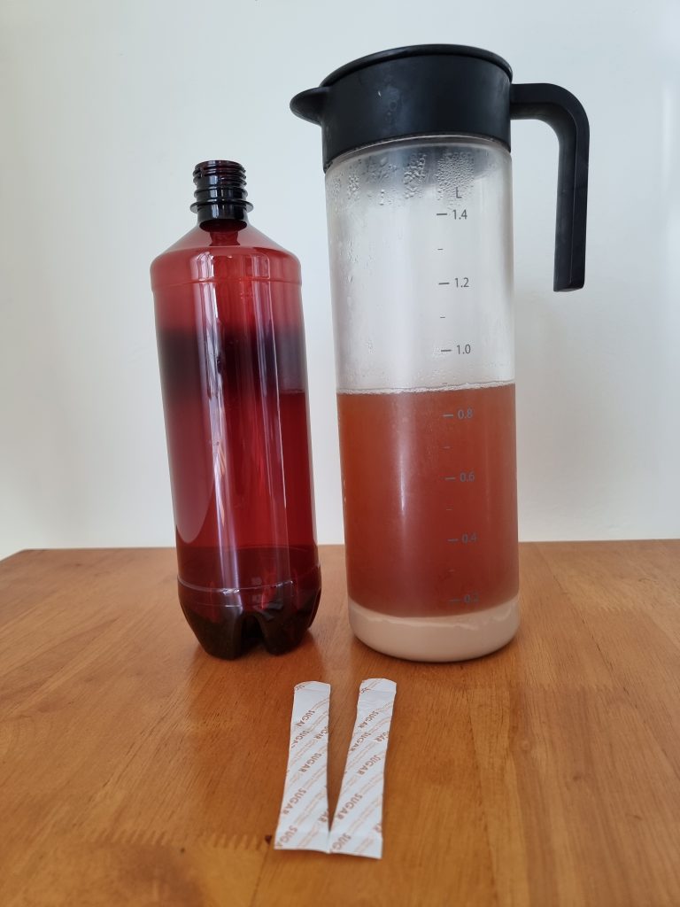 그리고 갈색(햇빛차단)의 내압페트병(탄산이 나가지 않는)을 소독해두고 탄산을 만들어내는 설탕을 함께 미리 준비 해둔다. 이때 설탕의 양은 1리터 페트병당 6g정도가 적당하다.