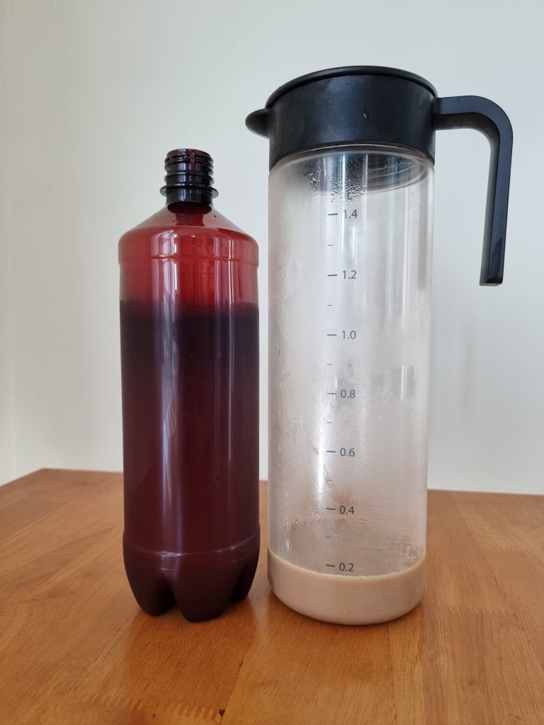 약 일주일가량 건드리지 않고 이 맥즙을 냉장고에 보관한다. 이대로 두면 흙탕물같던 맥주가 점점 맑은 색의 물과 연한 갈색의 진흙같은 것이 분리되어 가라 앉는다. 그럼 설탕을 먼저 페트병에 담고 윗부분의 맑은 맥주만 살살 따라 넣는다. 세게 콸콸 넣으면 애써 가라앉혔던 부분이 올라오니 살살.. 천천히 따르는것이 좋다.